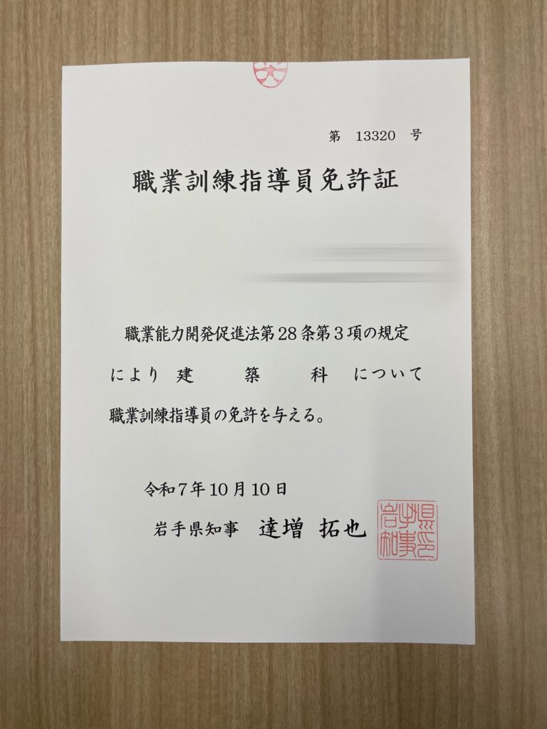 先日、当社社員が職業訓練指導員(建築科)の試験に無事合格し、晴れて免許を取得しました。