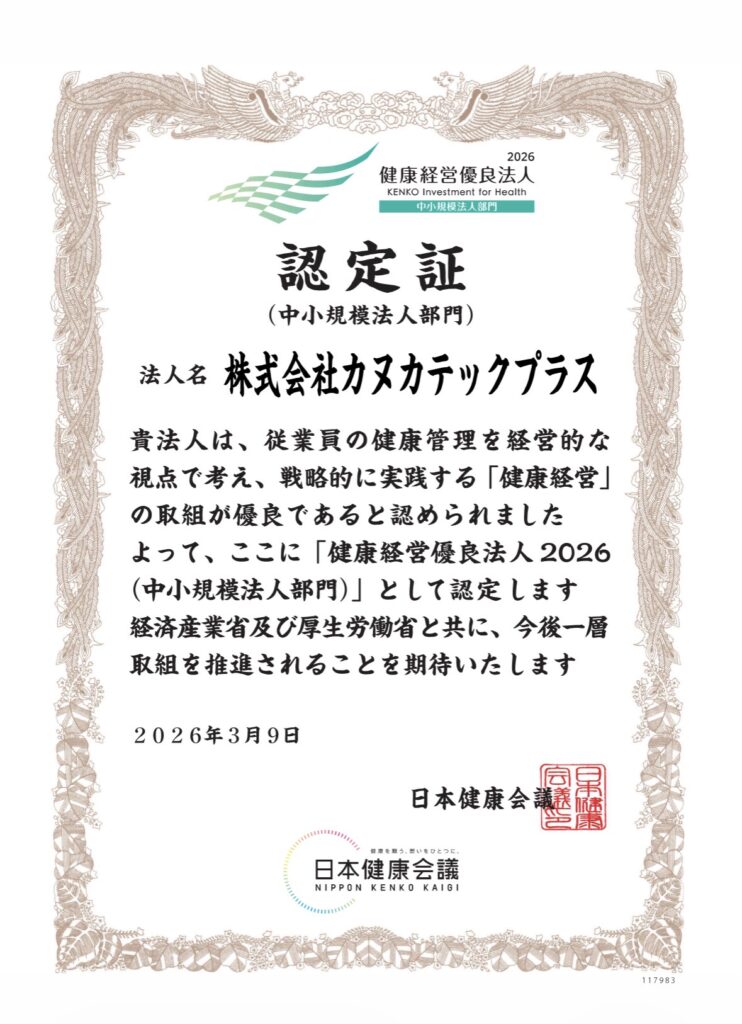 令和8年3月9日に「健康経営優良法人2026(中小規模法人部門)」に認定されました。